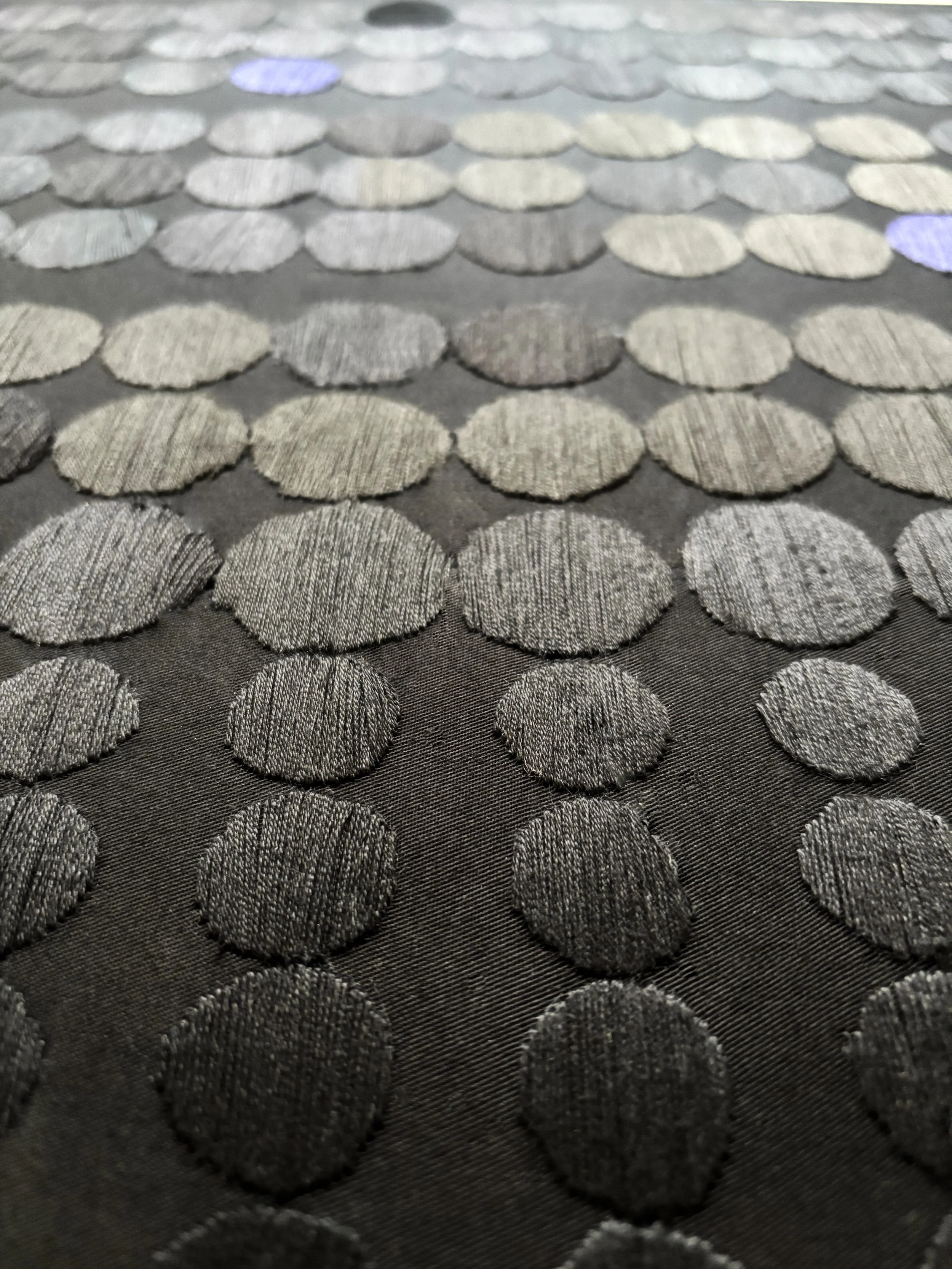 Particularly in her works using black thread on a black background, the pieces emanate a subtle, almost ethereal elegance. Through the precise interplay of matte and shimmering threads, as well as hidden color accents, the artist creates a deliberate sense of irritation. The work is never static; it responds directly to the natural course of the day and the shifting intensity of light.